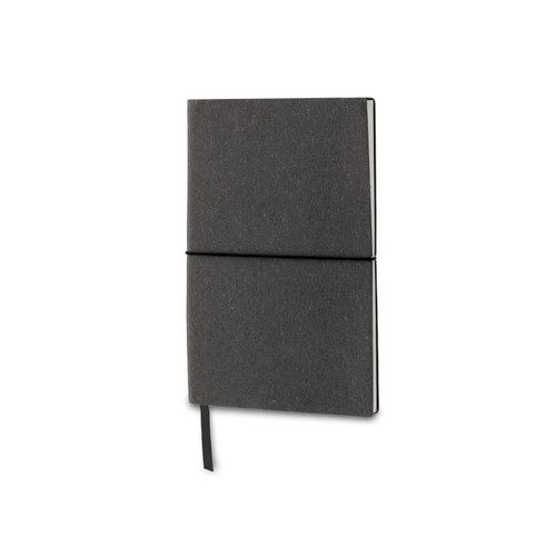 Carnet avec aspect naturel. La couverture est en cuir recyclée très résistante. Le carnet contient 160 pages de couleur crème et un ruban marque pages. Il se ferme à l'aide d'une élastique.