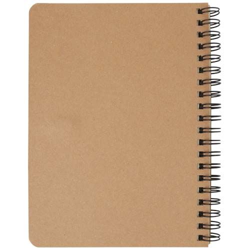 Carnet à la couverture en papier recyclé avec 60 pages format A6 en papier recyclé à lignes et son stylo assorti. Le carnet et le stylo sont emballés ensemble.
