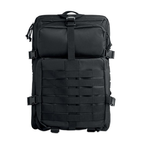 Sac à dos outdoor 50L en 600D RPET avec compartiment rembourré pour ordinateur portable et plusieurs compartiments intérieurs, poches frontales zippées, bretelles et dos rembourrés en filet, ceinture de hanches et supports élastiques pour les accessoires.