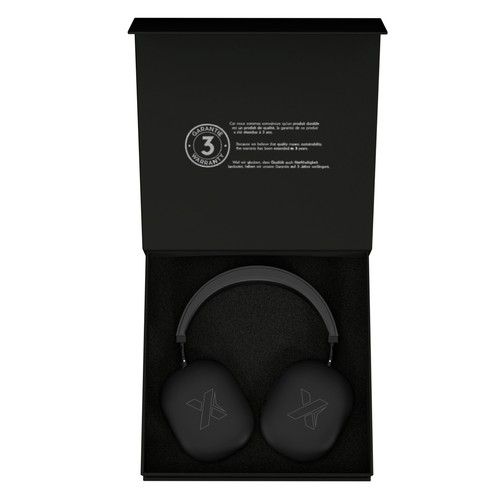 Tout est inclus : personnalisation du logo lumineux, finition rubber, câble de chargement, câble jack, étui en polyester et coffret cadeau recyclé et biodégradeable.
