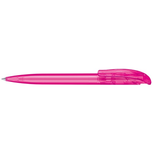 Stylo à bille rétractable avec corps et clip en plastique transparent.