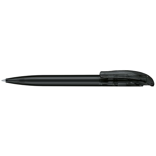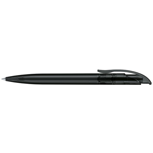 Stylo à bille rétractable avec corps et clip en plastique transparent.