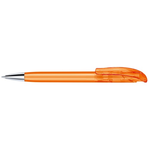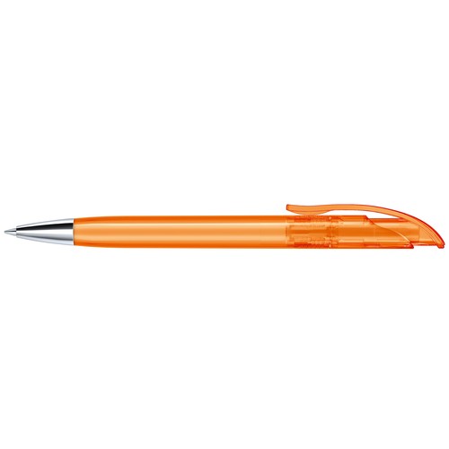 Stylo à bille rétractable avec corps en plastique transparent et pointe en métal.