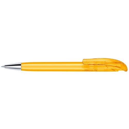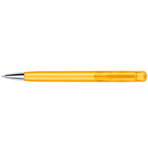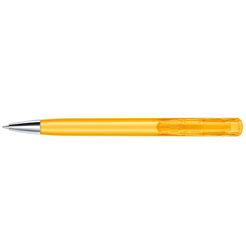Stylo à bille rétractable avec corps en plastique transparent et pointe en métal.