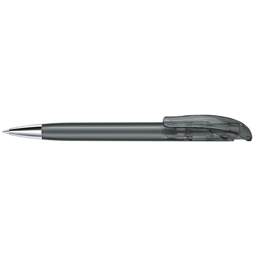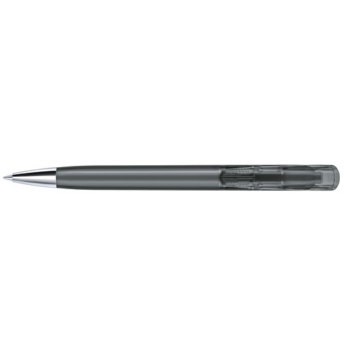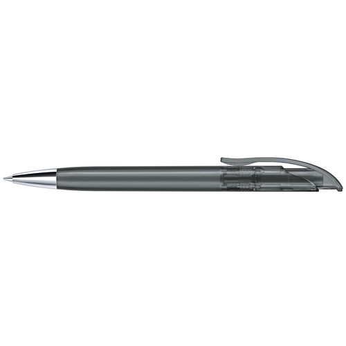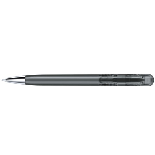 Stylo à bille rétractable avec corps en plastique transparent et pointe en métal.