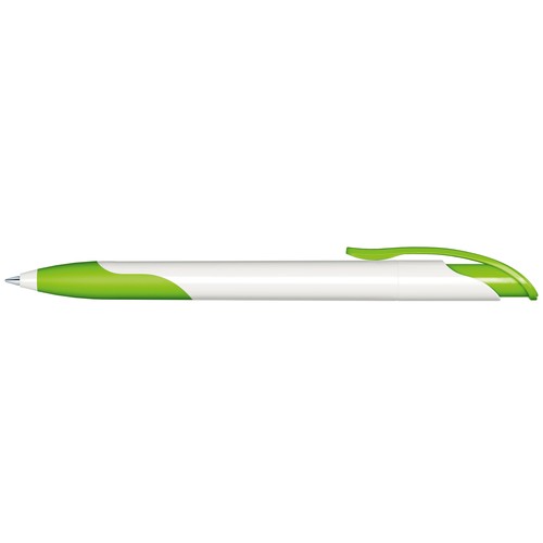 Stylo à bille rétractable avec corps en plastique opaque blanc, clip en plastique opaque de couleur et grip souple assorti.