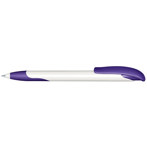 Stylo à bille rétractable avec corps en plastique opaque blanc, clip en plastique opaque de couleur et grip souple assorti.