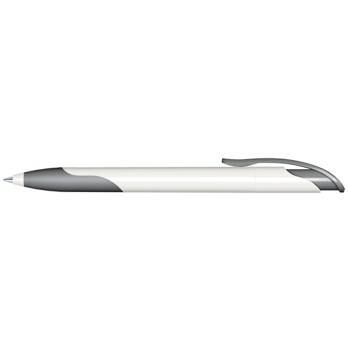 Stylo à bille rétractable avec corps en plastique opaque blanc, clip en plastique opaque de couleur et grip souple assorti.