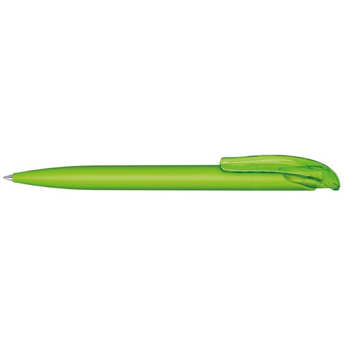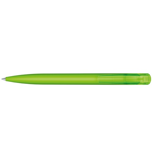 Stylo à bille rétractable avec corps soft touch et clip en plastique transparent.