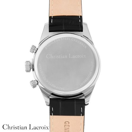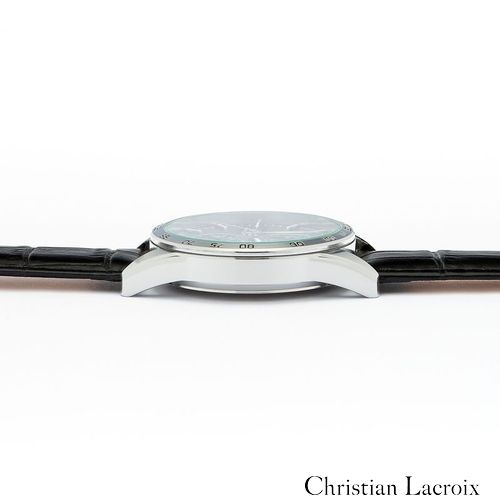 Voici la montre "Tempus" de Christian Lacroix, une fusion parfaite de style et de fonctionnalité. Ce garde- temps présente un design élégant avec un bracelet en cuir véritable noir présentant un motif de type croco, un boîtier chromé et un cadran ensoleillé vert foncé saisissant. Disponible en version dater ou chrono, le boîtier en alliage avec un fond en acier inoxydable garantit la durabilité, et avec une résistance à l'eau de 3 ATM, la montre "Tempus" est prête pour toutes les occasions. La sophistication intemporelle de Christian Lacroix rehausse votre garde- robe.