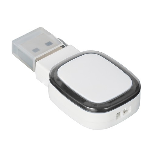 Cette clé USB avec port USB 2.0 est sur stock avec une capacité de mémoire de 4, 8 ou 16 Go. Capacités plus élevées à la demande. La bague de couleur sur l‘espace publicitaire s‘allume via LED.