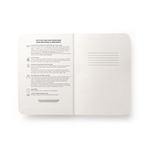 Bloc- notes A5 avec couverture semi- rigide fabriquée à partir de déchets de coques de café (65%) et déchets de coton (35%). Le papier intérieur est fabriqué à partir de déchets de coton (100%) et est très résistant. Contient 100 pages lignées et une bande de papier avec un dessin. Aucun déchet n'a été généré et aucun produit chimique ou arbre n'a été utilisé dans le processus de fabrication de ce bloc- notes. Le produit étant fabriqué à partir de matériaux naturels, la couleur du produit ainsi que le résultat de l'impression peuvent varier d'un produit à l'autre. 140 x 200 mm