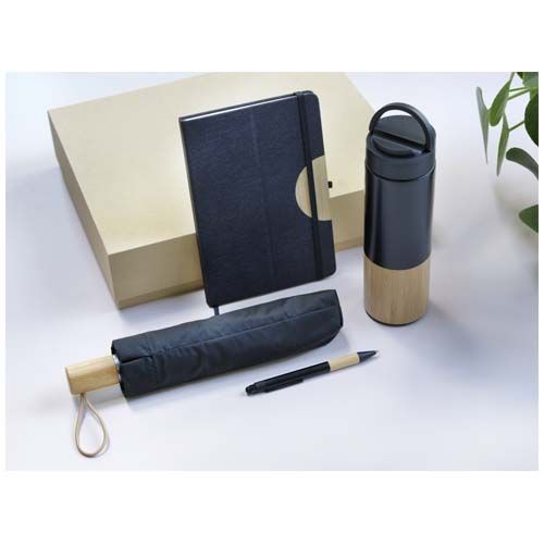 Le coffret cadeau Carmen comprend un carnet A5 à couverture rigide, un stylo bille, une bouteille d'eau et un parapluie. Le carnet est doté d'un élastique de fermeture noir, d'un ruban marque- page et de 80 feuilles lignées de couleur crème en papier 80 g/m². La couverture du carnet et le demi- cercle en bambou servent de socle de téléphone. Le stylo bille est fabriqué en aluminium recyclé certifié RCS et présente un revêtement noir et une poignée en bambou. Encre du stylo : Noire. Longueur d'écriture : 1 000 mètres. La bouteille d'eau de 450 ml est fabriquée en acier inoxydable et comprend un accessoire en bambou à sa base. Lavage à la main uniquement. Dimensions de la bouteille : 6,6 x 22,2 cm. Le parapluie de 21" est doté d'une toile en pongé noir, d'un mat en métal noir, de baleines en fibre de verre noires et d'une poignée en bambou. Dimensions du parapluie : 28,3 x 5,5 cm. Dimensions du coffret cadeau : 36 x 30 x 8 cm.