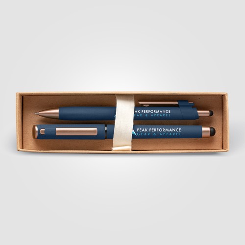 Élevez l’écriture quotidienne avec le coffret cadeau stylo York en plastique recyclé avec finitions bronze. Ce duo raffiné offre une présentation élégante et une performance fiable. Le coffret comprend un stylo- bille rétractable et un stylo gel à capuchon, tous deux fabriqués en plastique recyclé avec une finition texturée pierre distinctive et des accents bronze chaleureux. Présenté dans une boîte cadeau en papier recyclé certifié FSC, avec décoration en impression jet d’encre, il est disponible dans une palette de tons modernes et naturels. Les deux stylos disposent d’une décoration en impression jet d’encre pleine couleur et écrivent en douceur avec une encre noire Dokumental®, offrant des résultats constants pour les tâches quotidiennes ou en milieu professionnel. Ce coffret est idéal pour les cadeaux d’entreprise, le branding exécutif ou des cadeaux promotionnels haut de gamme.