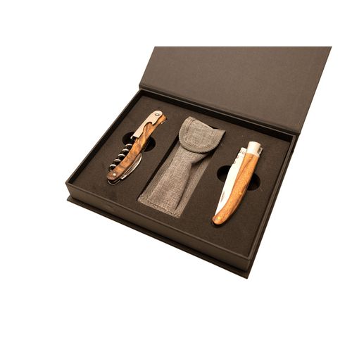 Coffret cadeau composé d'un couteau pliant 11cm et d'un sommelier. Manches en frêne exotique.