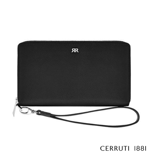 The CERRUTI 1881 Zipped travel wallet is the perfect accessory for travelling and organising all essentials, designed in a generous format and completed with a detachable leather wristlet for added practicality. When opened, it reveals eight card slots on one side and a gusseted compartment on the other, featuring a large zipped pouch, multiple note compartments, and a total of twelve additional card slots, along with a dedicated hook for a pen. Crafted from carefully chosen grained, best- quality leather, it is elevated by refined metal accents: the newly developed angular double R zipper puller brings a luxurious finishing touch, while the double R logo in crisp chrome enhances the classical black version with a timeless, sophisticated contrast.