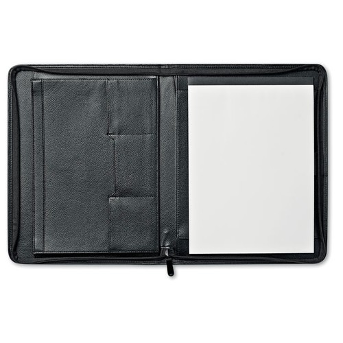 Conférencier A4 avec couverture en cuir collé. Zippé. Bloc- notes de 25 feuilles unies. 4 compartiments intérieurs. Porte- stylo.