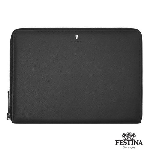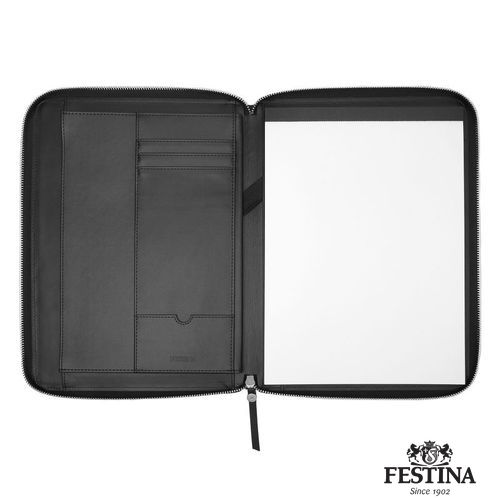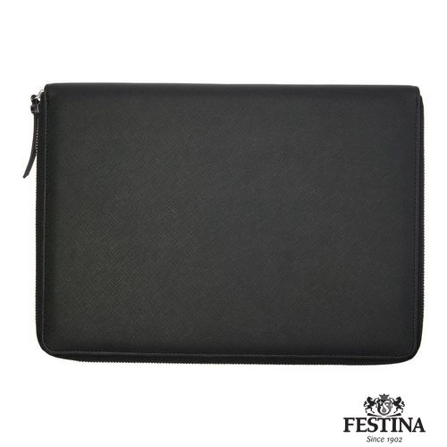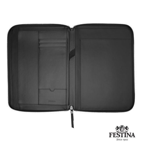 Ce porte- documents zippé Festina "Chronobike" est impeccablement conçu avec la texture saffiano caractéristique, avec la plaque F emblématique et une tirette de fermeture zippée signée. Disponible en une seule couleur : noir intemporel avec garnitures chromées, et en deux formats : A4 ou A5. Le complément idéal pour compléter votre collection d'écriture coordonnée.