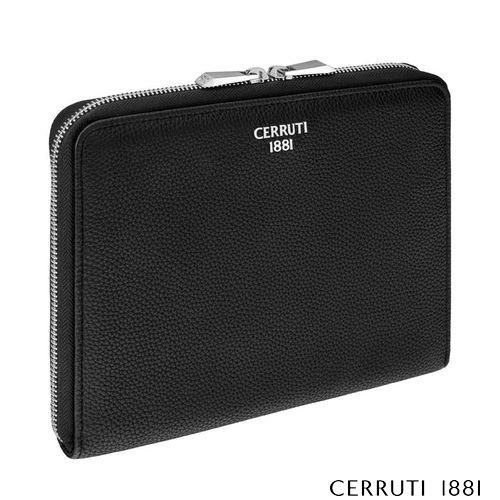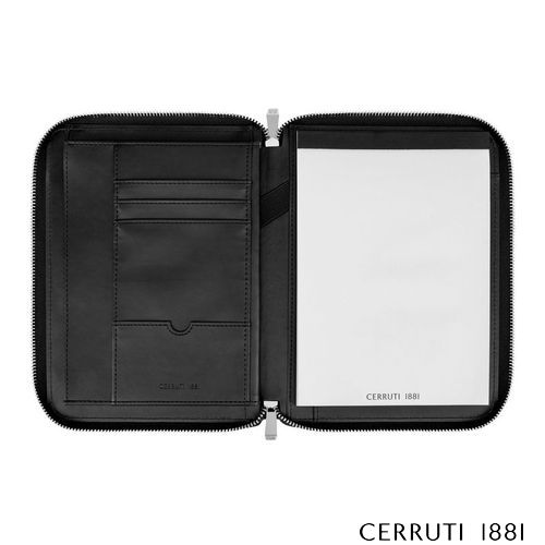 The Jefferson writing folder in black with chrome trims offers a classical and elegant interpretation of a functional writing accessory. Compact and minimal, it pairs beautifully with any Cerruti 1881 writing piece, while its carefully chosen matte- grained texture gives it a refined, contemporary tactility. Luxurious chrome metal accents elevate the design, featuring the new Cerruti 1881 plate celebrating the updated logo and the angular RR- engraved zipper pullers that add a precise finishing touch. The interior is thoughtfully organised with a gusseted compartment for cards, essentials, and documents, as well as an elastic slot for a pen. The folder is refillable with Cerruti 1881 signed paper, creating a timeless and beautifully crafted companion for daily use.