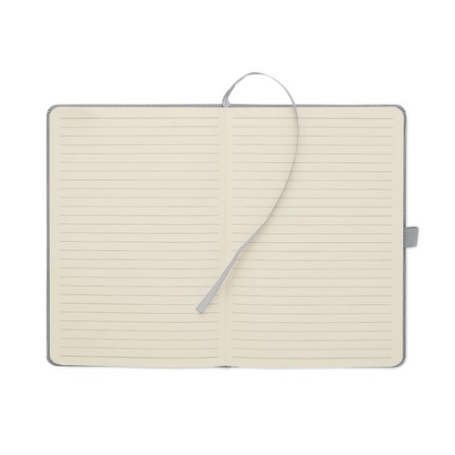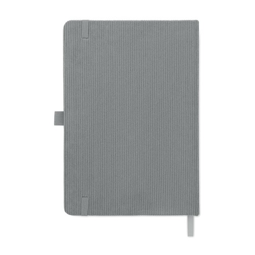 Carnet A5 avec couverture rigide en velours côtelé de polyester RPET et 192 pages lignées en papier recyclé (70 gr/m2). Reliure élastique, passant stylo, marque- page et étiquette en papier kraft.