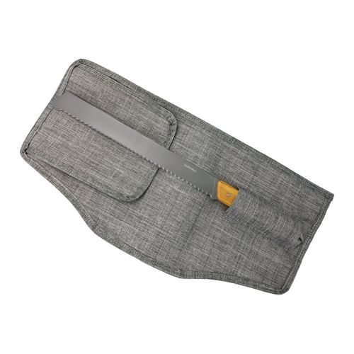 Lame dentée de 24cm en acier inoxydable 420 à usage alimentaire (acier martensitique conforme à la norme EN10088-2 2005) avec finition titane. Manche en bois d'olivier nervuré. Livré dans un roll up de rangement gris chiné en RPET.
