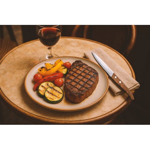 - Manche en ABS motif bois sur ce couteau à steak pour offrir la qualité visuelle du bois tout en étant parfaitement compatible avec un nettoyage au lave- vaisselle.