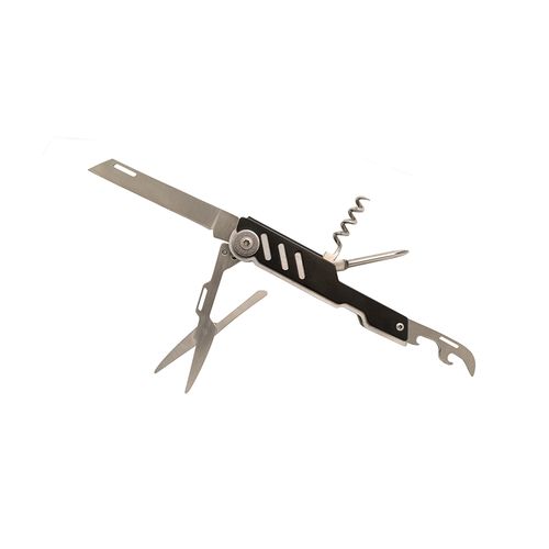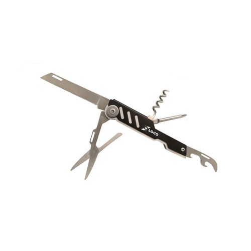 Eléments entièrement en acier inoxydable hautement résistant (2CR13). Manche en aluminium. Assemblage vissé Torx. 6 fonctions : couteau, décapsuleur, ouvre boite, tournevis cruciforme, ciseaux, tire- bouchon avec mèche 4 spirales. Trou pour anneau ou cordelette. Livré dans un étui gris chiné en RPET.