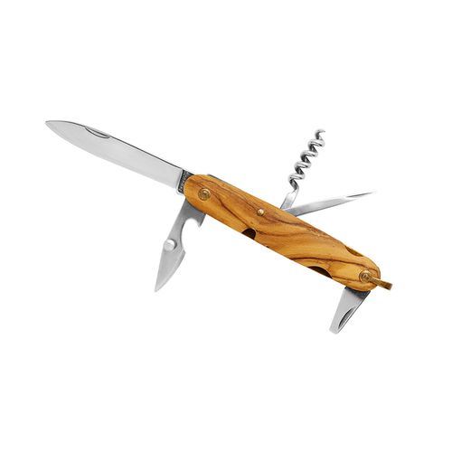 Eléments entièrement en acier inoxydable hautement résistant (2CR13). Manche en bois d'olivier. Assemblage riveté. 6 fonctions : couteau, petite lame canif, décapsuleur, tournevis plat 4 mm, poinçon, tire- bouchon avec mèche 5 spirales. Bélière en laiton. Livré dans un étui gris chiné en RPET.