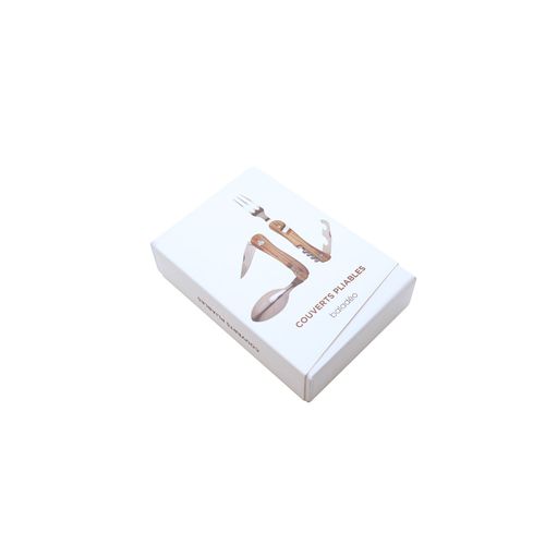 Couverts pliants en acier inoxydable 420 alimentaire. Manche en frêne exotique. Assemblage aimanté pour scinder le produit en deux parties et former ainsi une fourchette et un couteau (ou une cuillère). 6 fonctions : couteau, fourchette, cuillère, décapsuleur, ouvre boite, tire- bouchon avec mèche 4 spirales en acier inoxydable. Livrés dans un coffret cadeau en carton blanc.