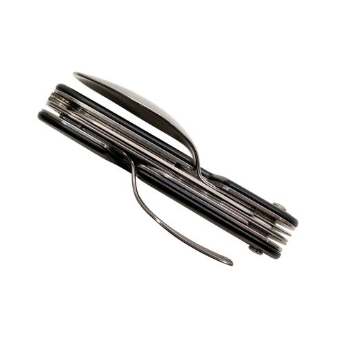 Couverts pliants en acier inoxydable 420 alimentaire. Manche en aluminium. Assemblage aimanté pour scinder le produit en deux parties et former ainsi une fourchette et un couteau (ou une cuillère). 5 fonctions : couteau, fourchette, cuillère, décapsuleur, ouvre- boite. Livré dans un étui gris chiné en RPET.