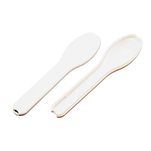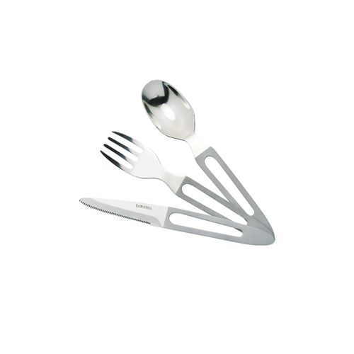 Couverts en acier inoxydable 420 alimentaire. 3 fonctions : couteau avec lame microdentée, fourchette, cuillère. Livrés dans un étui de rangement blanc en ABS.