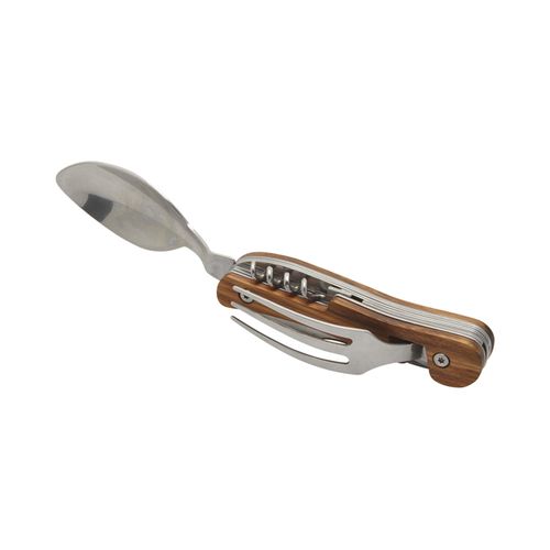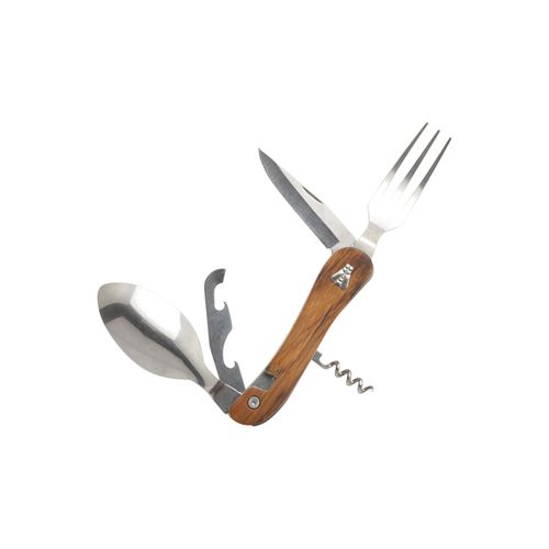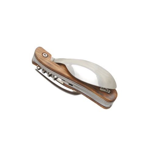 Couverts de voyage pliants en acier inoxydable 420 alimentaire. Manche en frêne exotique. Assemblage aimanté pour scinder le produit en deux parties et former ainsi une fourchette et un couteau (ou une cuillère). 6 fonctions : couteau, fourchette, cuillère, décapsuleur, ouvre boite, tire- bouchon avec mèche 4 spirales en acier inoxydable. Livrés dans un coffret cadeau en carton blanc.
