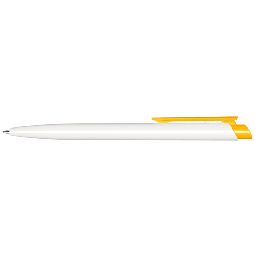Stylo à bille rétractable avec corps en plastique blanc et clip de couleur.
