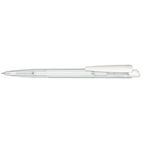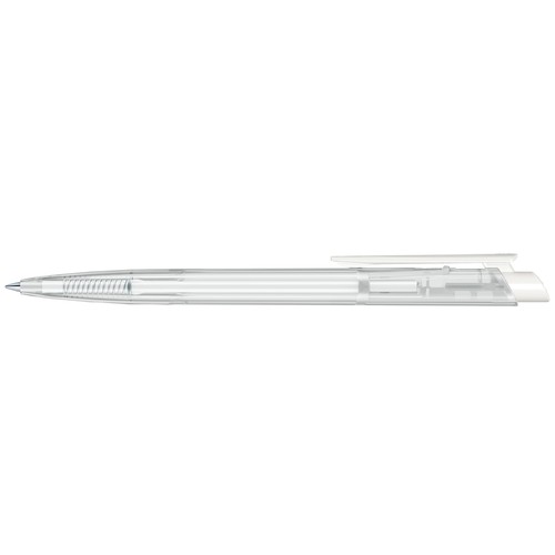 Stylo à bille rétractable avec corps en plastique transparent et clip en plastique opaque.