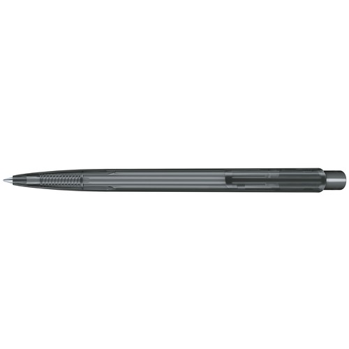 Stylo à bille rétractable avec corps en plastique transparent et clip en plastique opaque.