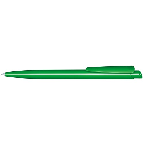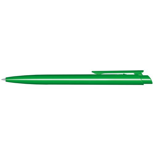 Stylo à bille rétractable avec corps et clip en plastique opaque.