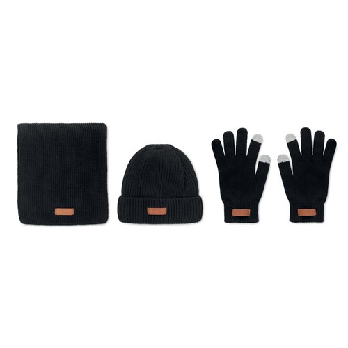 Ensemble d'hiver 3 pièces. Comprenant un bonnet en RPET, une écharpe et des gants tactiles avec une étiquette pour la zone d'impression. Taille adulte unique.