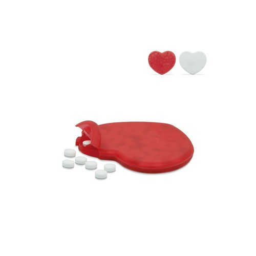 Boîte de bonbons menthe en forme de coeur. En couleurs transparentes rouge ou blanc opaque. Env. 7 grammes.