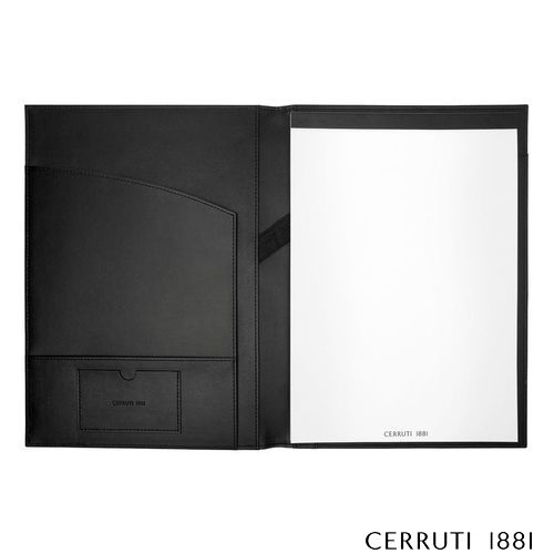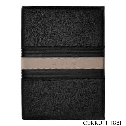 Voici les chemises d'écriture CERRUTI 1881 "Delano", fabriquées en cuir végétalien noir classique avec une bande beige contrastante et un logo surdimensionné subtilement embossé. Ces chemises, disponibles en formats A4 et A5, offrent une option élégante pour prendre des notes en réunion ou noter des pensées en déplacement.