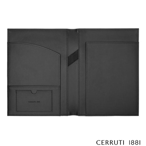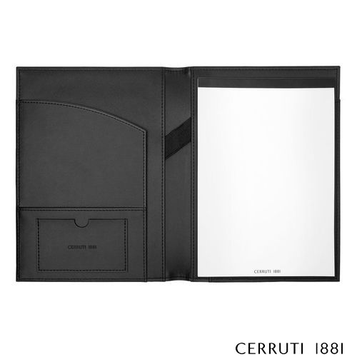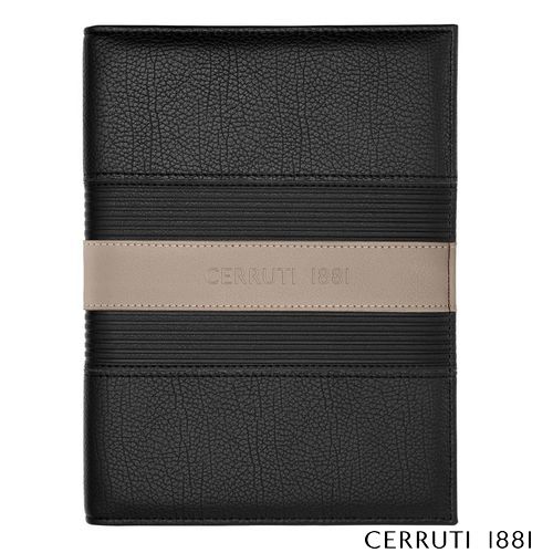 Voici les chemises d'écriture CERRUTI 1881 "Delano", fabriquées en cuir végétalien noir classique avec une bande beige contrastante et un logo surdimensionné subtilement embossé. Ces chemises, disponibles en formats A4 et A5, offrent une option élégante pour prendre des notes en réunion ou noter des pensées en déplacement.