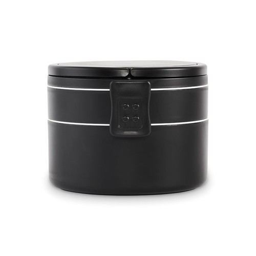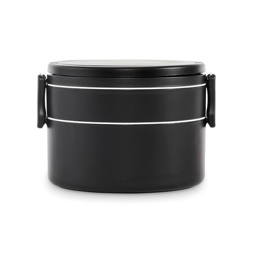 Boîte à lunch ronde à deux niveaux en PP avec fermeture à clip latéral et poignées. Couvercles intérieurs inclus. Capacité 250 ml en haut, 700 ml en bas.