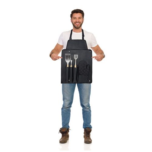 Ensemble à barbecue composé de 5 pièces dont une pelle (36,5 x 7 cm), une fourchette (36,5 x 2 cm), une pince (36,5 x 5 cm), un gant (25 x 16 cm) et un tablier avec poche (42 x 60 cm). Les poignées sont fabriquées en bambou dont l'origine et la production sont conformes aux normes de durabilité.