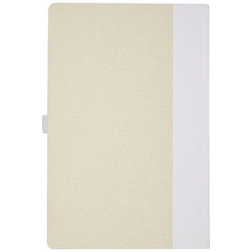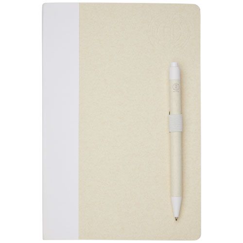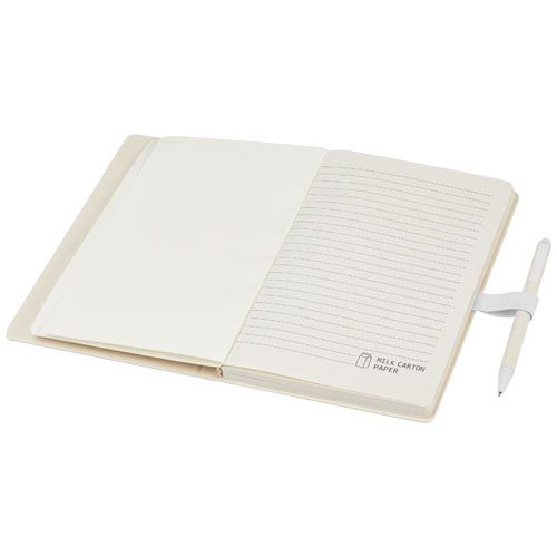 Un ensemble composé d'un carnet de notes format A5 et d'un stylo bille. Le carnet comprend 80 feuilles lignées (80 g/m²) fabriquées à partir de briques de lait recyclées (jusqu'à 70 %), des spirales en papier coloré et une boucle à stylo. La boucle à stylo contient un stylo bille à bouton- poussoir de la même couleur que le carnet. Le corps du stylo est fabriqué à partir des mêmes briques de lait recyclées et le bouton, l'attache et la pointe sont en plastique PLA coloré. Le stylo contient une recharge noire. Les briques de lait usagées sont collectées, triées, traitées et transformées en papier, transformant ainsi les déchets en quelque chose d'utile.