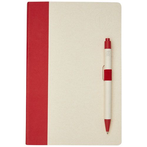 Un ensemble composé d'un carnet de notes format A5 et d'un stylo bille. Le carnet comprend 80 feuilles lignées (80 g/m²) fabriquées à partir de briques de lait recyclées (jusqu'à 70 %), des spirales en papier coloré et une boucle à stylo. La boucle à stylo contient un stylo bille à bouton- poussoir de la même couleur que le carnet. Le corps du stylo est fabriqué à partir des mêmes briques de lait recyclées et le bouton, l'attache et la pointe sont en plastique PLA coloré. Le stylo contient une recharge noire. Les briques de lait usagées sont collectées, triées, traitées et transformées en papier, transformant ainsi les déchets en quelque chose d'utile.