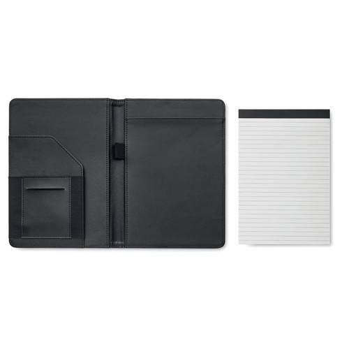 Conférencier A5 en 300D RPET 2 tons. Bloc- notes A5 remplaçable. 40 pages blanches lignées en papier bambou (20 feuilles). Porte- stylo. Porte- cartes à l'intérieur et un grand compartiment.