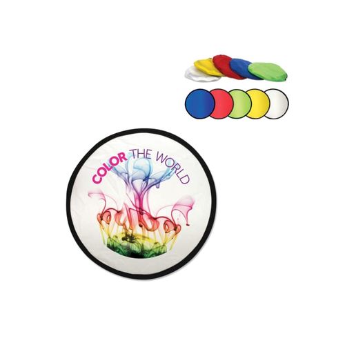 Frisbee en nylon, pliable dans une pochette. Impression standard sur le frisbee, mais possibilité d'impression également sur la pochette (impression par transfert). Dim. Pochette: 100x85 mm. A partir de 5.000 pièces nous pouvons imprimer en quadri.Matières :Nylon, Métal