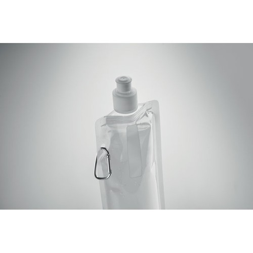 Gourde pliable en PET sans BPA, avec mousqueton en aluminium. Contenance 480 ml. Anti fuite.