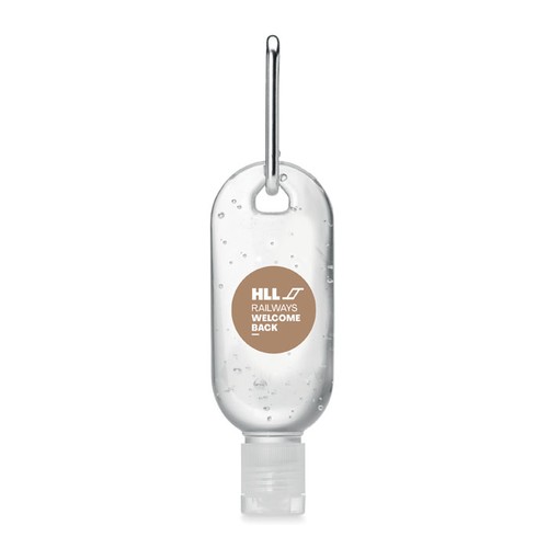 Gel nettoyant pour les mains en flacon PET rechargeable avec capuchon à clapet et mousqueton. Contenance 30 ml