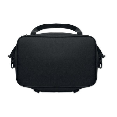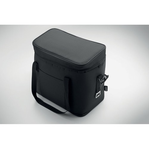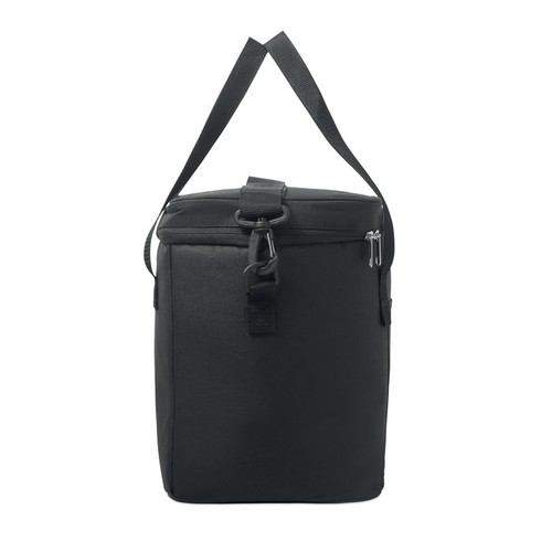Sac isotherme 18L en polyester 600D RPET revêtement PU. Comprend 1 poche frontale et 1 poche intérieure en filet 2 poignées et 1 bandoulière réglable. Doublure isolante en PEVA et mousse PE de 6 mm.