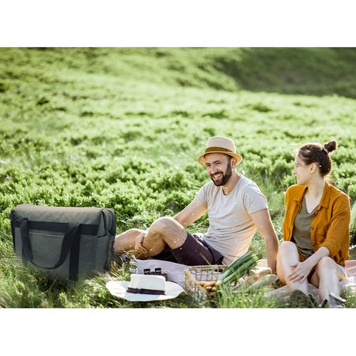 Glacière isotherme en tissu wulong gris chiné RPET. Finition isolante de 5mm d'épaisseur. Poche ventrale et espaces de rangement de chaque côté. Ouverture large avec clips latéraux de maintien. Poignées et bandoulière asymétrique réglable, chacune matelassée. Fermeture éclair étanchéifiée. Structure renforcée sous le sac. Contenance : 36 L.